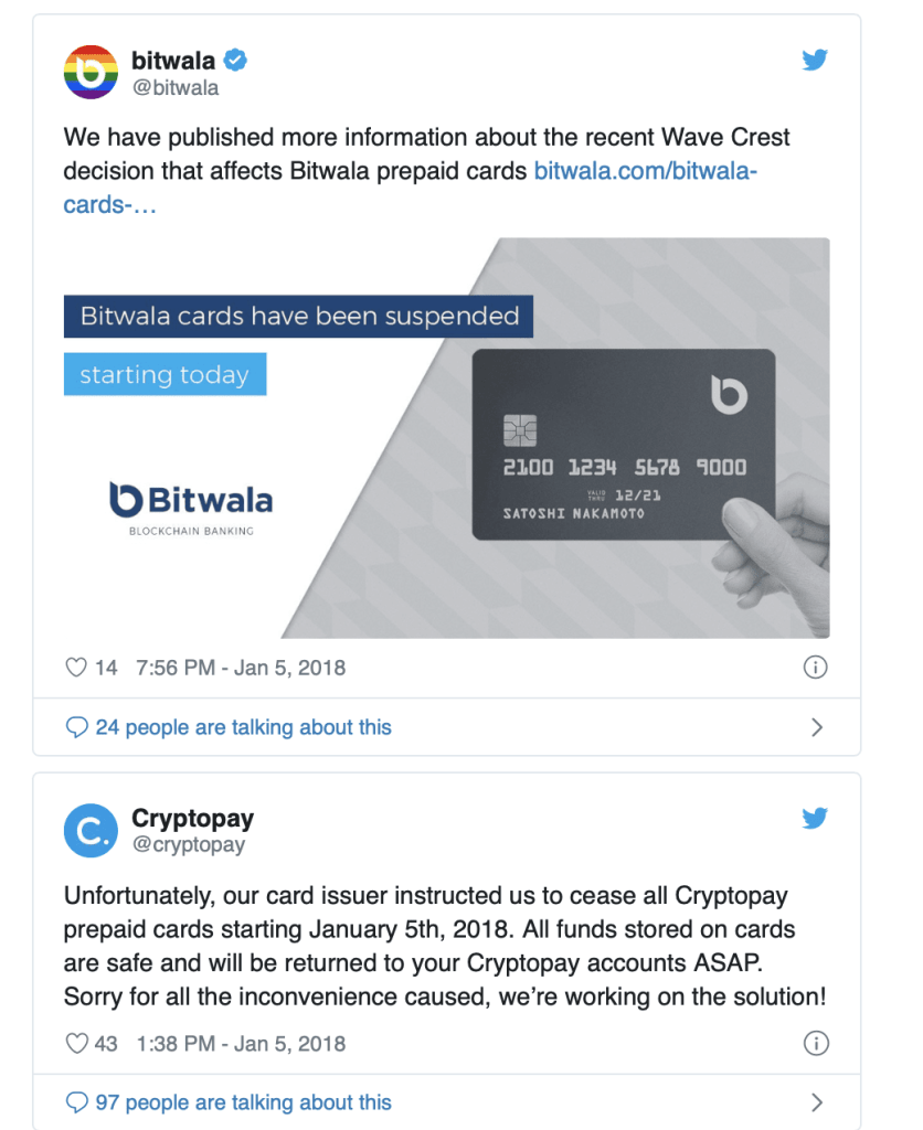 Ainsi, on se souvient de Wave Crest qui, en 2018, avait suspendu après de fortes suspensions auprès de certains clients leurs partenariats, comme Bitwala et CryptoPay.