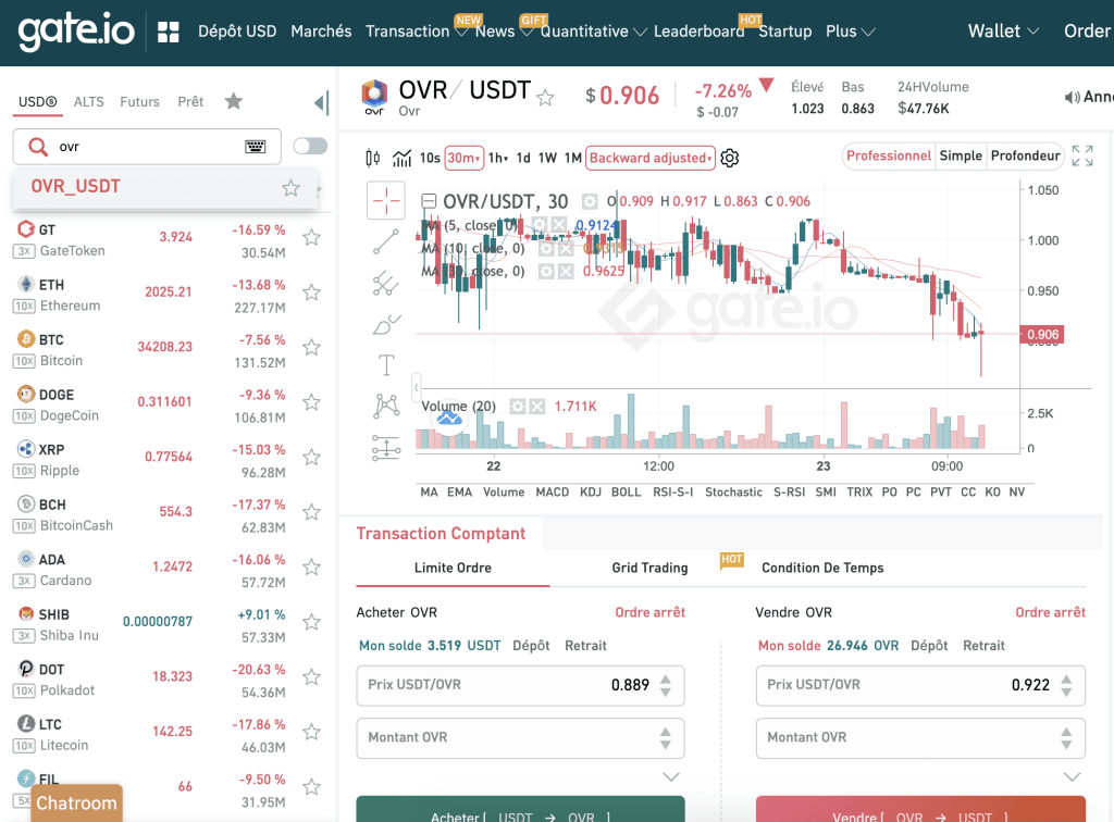 Ensuite, avec vos USDT, il faudra vous rendre dans l’espace trading spot fondamentale( onglet Transaction fondamental dans la traduction en français du site), pour trouver la paire USDT/OVR. Là, bien entendu, il faudra vendre vos USDT contre de l’OVR.